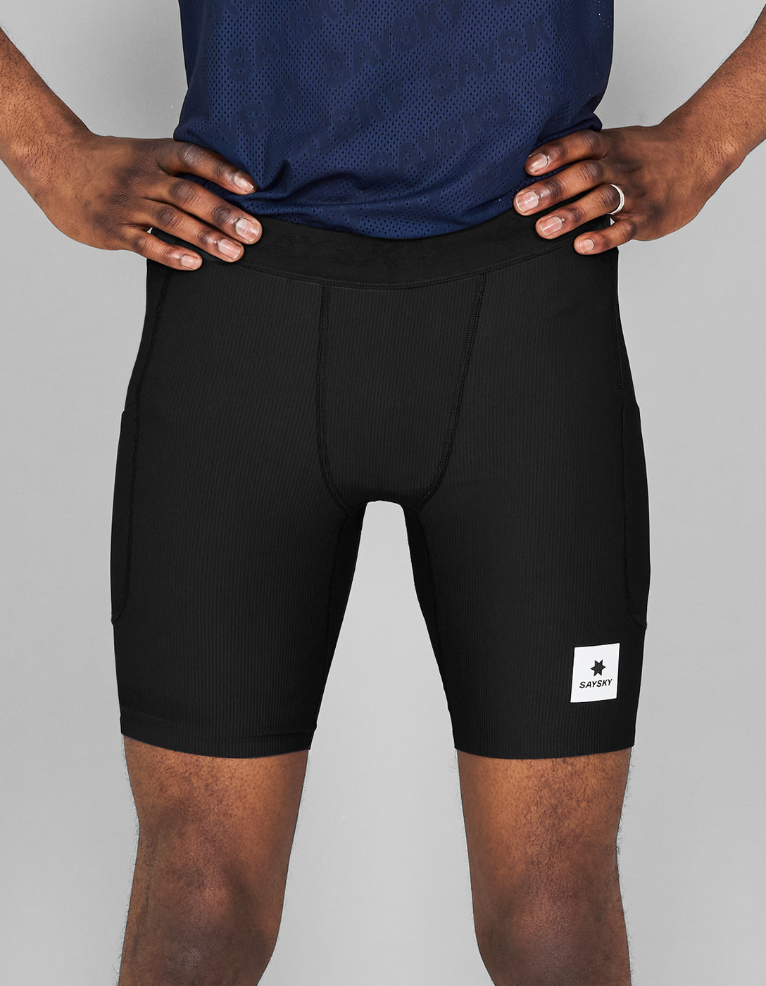 The SAYSKY Combat+ Rib Short Tights 8" are designed with a slim fit and a breathable ribbed construction to support high-effort runs. Featuring a silicone gripper hem for a locked-in feel and a jacquard waistband for comfort, these race-ready tights also offer multiple storage options, including two side pockets and a zip pocket at the back. Lightweight, technical, and built for focus.